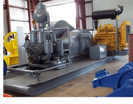 Duplex mud pump package completely refurbished and never operated. Tri-Services Manufacturing TSM-500 pump, CAT engine. Data book provided with complete refurbishment details.